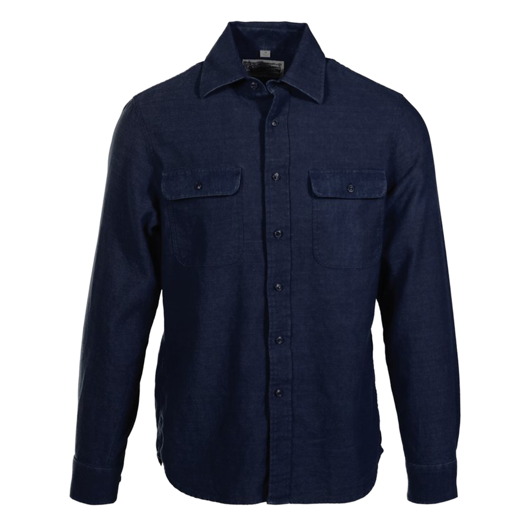 Both the warp and weft are made of indigo dyed yarns which are loomed in a basket weave to create this double indigo shirt with cat's eye buttons