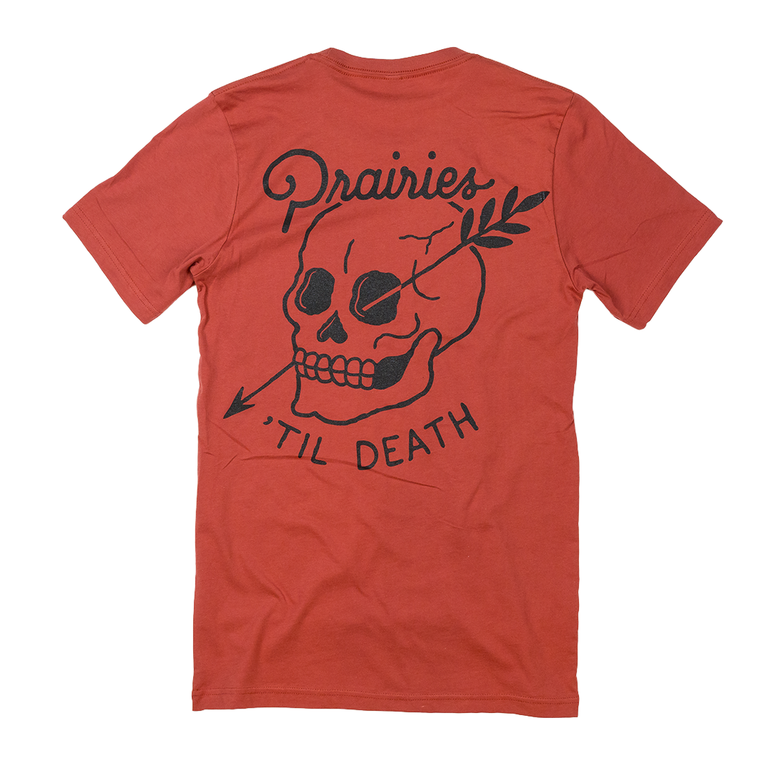 Red Rust 100% Combed Ringspun Cotton. Black 'til death Logo left chest and large center back print. Printed in Canada.