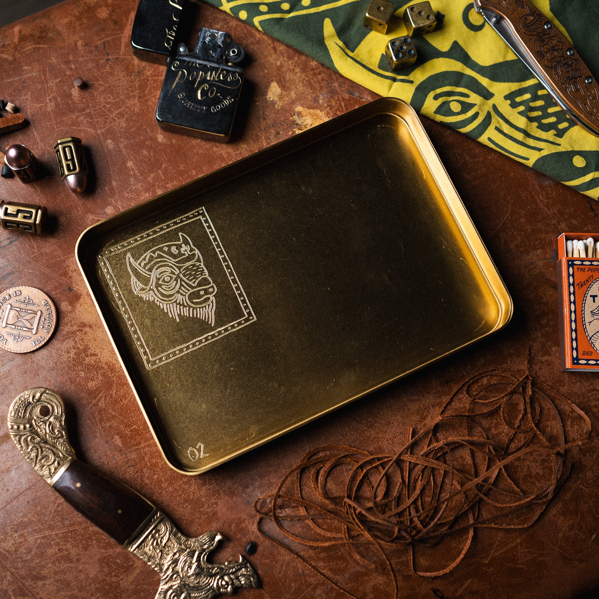 We’ve partnered with prairie creative BrookHayl (Allan Horvatt) to create an exclusive collection hand-engraved Brass Trays. Use this catch-all tray to dump your daily essentials, organize your desk, or hold your jewelry and finest goods. Includes a handmade Populess leather insert.