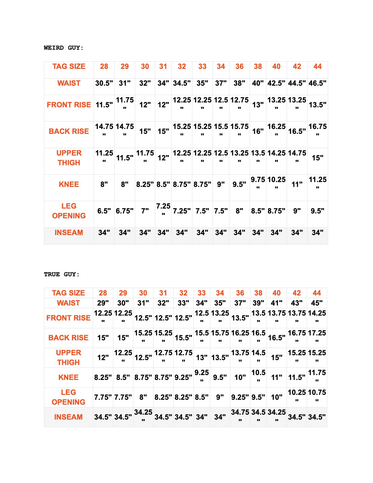 | SIZE | WAIST | RISE | THIGH | INSEAM | LEG OPENING |